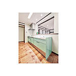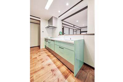 やさしいグリーン色のキッチン扉、「ほっとくリーンフード」は奥様たってのご希望。