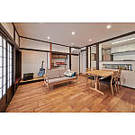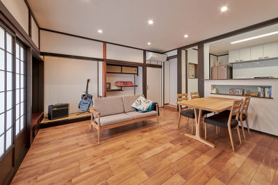 障子と天然木のフローリングが美しく融合した和モダンリビング。障子と、その向こうに縁側を残し、やさしい光に包まれるあたたかなリビングに。