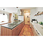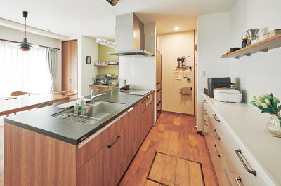 バスルームなどの水廻り動線を考えて配置したキッチン。家事効率がアップ。「Lクラス」キッチンで作業スペースが広くなり、お子様たちのお手伝いも増えました。