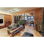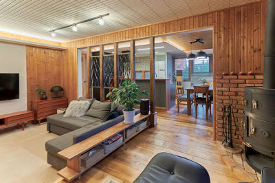 薪ストーブ側と段差があるスキップフロアで視線の高低差が生まれ、より広く感じられるリビング。30年前のデザインを受け継いだスタイリング。
