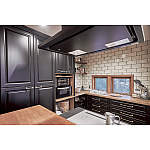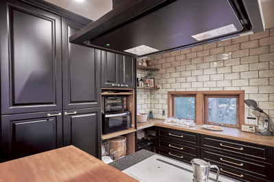 パントリー使いができる、キッチン収納。框扉やカウンター、タイルで味わいある空間に。