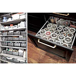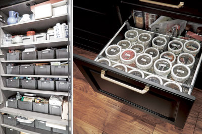 カタログに掲載しているキッチン収納の内寸を調べ、ぴったり納まるように容器を購入。食器や調理道具などをすっきり収納。