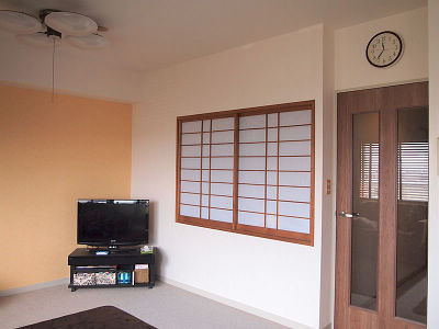 リビングの扉をガラス組み込みに変えました。暗かった廊下にも陽差しが入り明るくなりました。