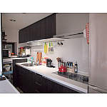 使い慣れた動線は変えずに、キッチンの収納・カップボードの収納と使い分けられるようにしました。家電収納もひとつにまとめました。