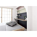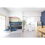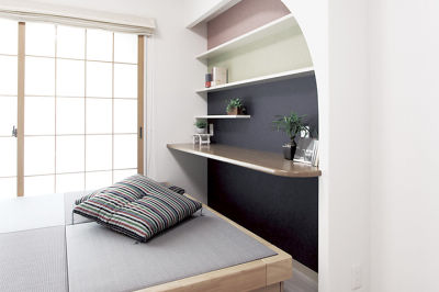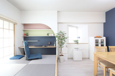 三色団子のような色あいで遊び心のあるワークスペース。畳が丘で休憩もしやすく収納もたっぷり。