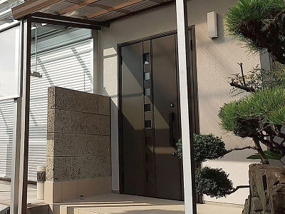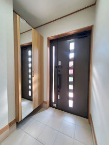 以前の玄関ドアは汎用アルミドアで防犯面が不安でしたが、リフォーム用の玄関ドアへ取替え防犯・断熱性能を向上。お出かけに便利なミラー付きのクロークボックスも設置しました。