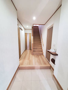 以前はパンチカーペット貼りの階段でしたが、転倒防止対策として、ノンスリップ付きのリフォーム階段上貼りタイプを採用しました。手すりも取り付けたので不安感が解消されました。Panasonic システム階段リフォーム上貼りタイプ/連続手すり
