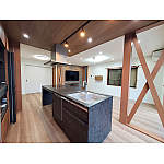 間仕切壁を無くして左右対称の筋交表しに。強度を保ちながらダイニングキッチン・リビングが繋がった広々デザイン空間に。