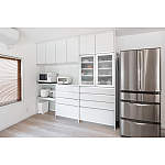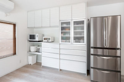 天井まである大容量カップボード。収納を一か所にまとめ、調理家電の配置にもこだわったことで家事がスムーズに。