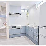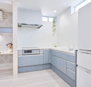 システムキッチンは「ラクシーナ」。L型にすることでスペースをコンパクトにまとめました。ブルーグレーオークの扉柄が空間のアクセントに。