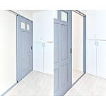「クラフトレーベル」の建具はキッチン扉柄と色を合わせました。下枠までカラーを統一したことで、ドアを開けていても廊下との境界線をさりげなく演出。