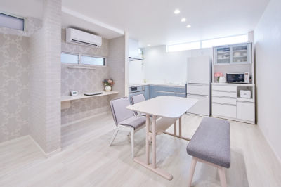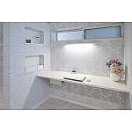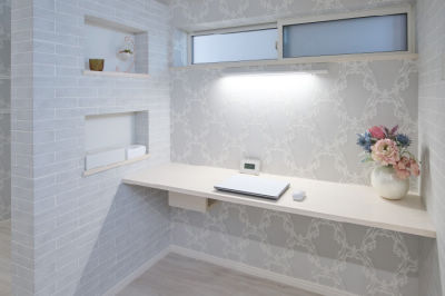 パソコン用のカウンターはお子様の学習スペースとしても活躍。ライン照明はスタンドライト代わりに。壁付けなのでカウンターが広々。