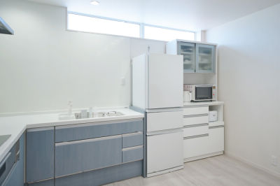 通りからの視線を考慮して高窓を採用。冷蔵庫や高さのあるカップボードを設置しても隠れません。