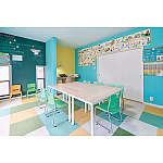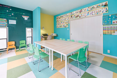 軽やかな色彩の英語教室。かつての押し入れ部分は、先生である奥様のデスクコーナーとマグネット黒板スペースに生まれ変わりました。
