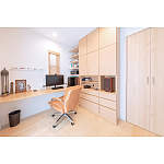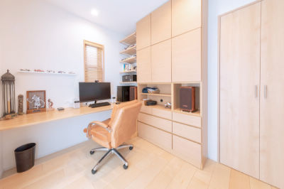 リビングに隣接する書斎は、家族の気配を感じながらも落ち着いて過ごせる離れのよう。幅2700mmの「インテリアカウンター」を広々したデスクに。