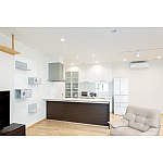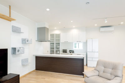 白を基調にしたことで明るく広がりを感じるLDK。ウォールナット色のキッチンが空間を引き締めるアクセントになりました。高いところが大好きな愛猫が一緒にリビングでくつろげるように、壁面上部にキャットウォークを設置しました。
