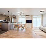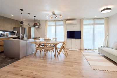家族が集うリビングは、ナチュラルなフローリングでやわらかなイメージに。内窓を設置し、あたたかさだけでなく静音性も高めたことで、お子様ものびのびと楽しんでいます。