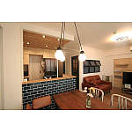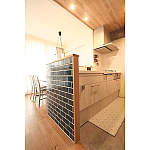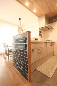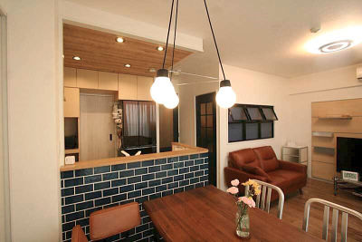 キッチン腰壁にブルックリンタイルを採用。ペンダント照明も雰囲気に合うものをご提案し、カフェのような空間に。