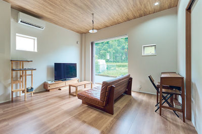 リビングの大きい窓は「愛猫が外に出ないように」とのご希望でFIX窓に。枠のないシンプルな窓は、緑の景色を切り取る額縁のようです。