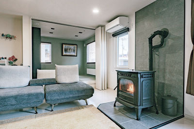 存在感のあるペレットストーブはリビングの主役。火を入れていなくてもインテリアとして空間にあたたかみを与えています。