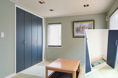 和室に大きな収納を設置。ストーブの燃料であるペレットを保管する床下収納も設けています。