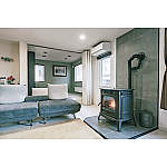 鋳物のストーブが映える壁材と床タイルを選び、モダンな印象のステージを造作。