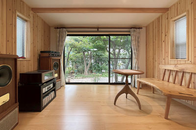 スピーカーの正面に座って音楽を楽しめるよう、木目調のベンチとテーブルを置いてカフェ風に。