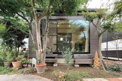 庭に面した壁ほぼ一面を大きな掃き出し窓に。外とのつながりを感じさせ、開放感を与えます。