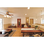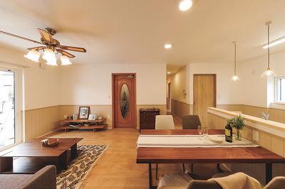 ペットと暮らす親世帯のリビング。ナチュラルであたたかみのある空間に、腰壁クロスで耐久性を高めています。