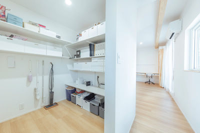 子世帯リビングのテレビの裏側はクローゼット。リビングで使うものもスッキリ収まります。