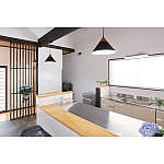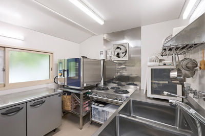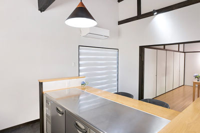 本格的な業務用設備を配置した離れのお菓子づくり工房。動線を考えて、作業しやすいようコンパクトに仕上げました。