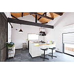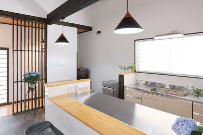 勾配天井が開放感を生み出すダイニングキッチン。夜はペンダントライトで落ち着いた雰囲気を演出し、お酒を楽しめるバーカウンターに。