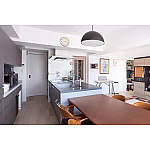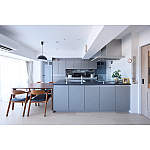 カップボードの吊り戸は手の届く高さに調整し、出し入れしやすく。大人な印象の空間に合わせてインダストリアルなタイルを採用。