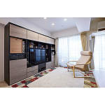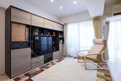 リビングには大容量の壁面収納を設置。デザイン性と機能性を兼ね備え、お部屋をすっきりと保てます。