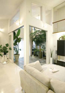 天井を抜き、透明ガラスのスライド扉で間仕切ったご主人のこだわりのテラス。扉を開けると光がリビングに差し込み、天井にも届く大きな観葉植物が家族に安らぎをもたらしています