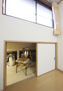 LDKと水まわりの位置を入れ替え、家族が集いやすいようLDKを家の中心に。南北に長い20畳の大空間には、南側に大きな窓を、北側のキッチンの上に天窓を設け、光に満ちた明るい空間を実現されました。限られたスペースで二世帯分の収納量を確保するため、各部屋はもちろん小屋裏までも収納として活用。お母様と3人が仲良く快適に過ごせる、共有型二世帯住宅が完成しました。