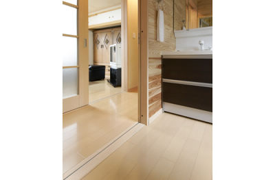 洗面室からリビングへ通じる通路。足腰の弱いご主人のために、将来の車イス生活を見据えて徹底的に段差をなくしました。
