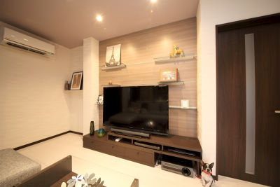 リビングのディスプレイをライトアップ。光と影のコントラストも夜間ならではの楽しみ方。テレビ背面の壁には木目柄のパネルで個性を演出。