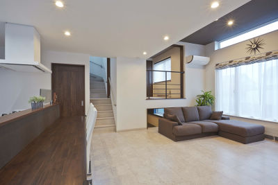 ご家族が増えて玄関やLDKも手狭になり、何かとお困りだったM様。そんなお悩みをすべて解決できるよう、1階は部屋数を変えずに、リビングの天井高を90センチ高くした「プチ吹き抜け」を採用。屋根や壁、基礎を外断熱にすることで小屋裏空間を減らし、その分、縦に広い伸びやかな家族の共用空間が生まれました。