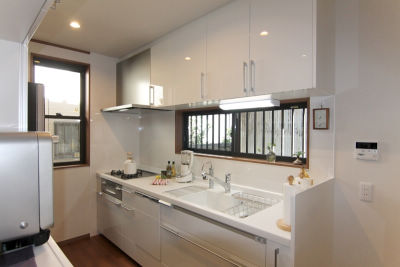 収納場所も十分に確保でき、ホワイトの扉で北側キッチンでも明るくスッキリ。キッチン部のエンドパネルはリビングから手元が
