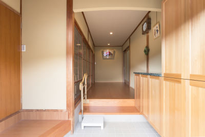 玄関には式台や手すりを設け、段差の少ないバリアフリー空間に。