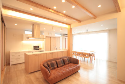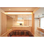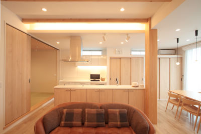 や、設備の老朽化がきっかけで建替を決意されました。建替前はリビングとダイニングが別々に分かれているなど1部屋1部屋が狭く、また収納も不足していたためベビー用品やお子様のおもちゃを片付けるのが大変だったというM様。そこで、玄関横の大型収納や洗面室、ダイニング等に適材適所の収納スペースを確保。キッチン背面の収納には、なんと冷蔵庫もすっぽり収まります。「キッチン全体が見えるので、生活感を出したくなかったんです」とM様が言うように、扉を閉めれば中が見えず、お部屋の印象もすっきり。間取りに合わせた効率的な収納スペースが、インテリアやお部屋のテイストに自然と溶け込んでいます。 現在は育休中ですが共働きで忙しい奥様のため、LDKを中心に生活動線も見直しました。回遊できるキッチンは、調理中の出し入れや行き来もスムーズ。水廻りにもアクセスしやすく、お部屋とお部屋を行ったり来たりする必要がありません。カウンターからは室内が一望できるため「家族がどこにいても家族のつながりを感じられるんです」と、奥様もニッコリ。どこへ行くにも家族が必ずリビングを通る間取りは、家事をしながらでも自然なコミュニケーションを生んでくれます。その他にも、キッチンに隣接の和室は、お子様のお昼寝スペースや洗濯物を畳んだりなど、多目的に使える憩いの空間。お部屋全体を包み込むメープル材のナチュラルな雰囲気は、インテリアがお好きなご夫妻が自らセレクトしたものだそう。家族にうれしい住み心地の中にも、さりげないこだわりが詰まっています。