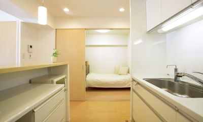 お身体の弱いお母様を見守りながら、家族3人で仲良く暮らそうと、中古マンションを購入してリフォームされたT様。まずは窓のないダイニングキッチンと和室2部屋という一昔前の間取りの大改造に取り組まれました。眺めのいいバルコニー側にLDKを移し、お一人お一人の個室も確保。家事をしながらお母様の様子が分かるようにと、お母様の個室はキッチンと横並びの位置に配置。引き戸を開ければLDKとひと続きの空間となります。