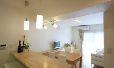 お身体の弱いお母様を見守りながら、家族3人で仲良く暮らそうと、中古マンションを購入してリフォームされたT様。まずは窓のないダイニングキッチンと和室2部屋という一昔前の間取りの大改造に取り組まれました。眺めのいいバルコニー側にLDKを移し、お一人お一人の個室も確保。家事をしながらお母様の様子が分かるようにと、お母様の個室はキッチンと横並びの位置に配置。引き戸を開ければLDKとひと続きの空間となります。