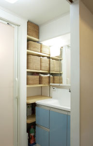 小物やタオル類などの収納場所を確保して、洗面スペースをスッキリ保てるようにしました。