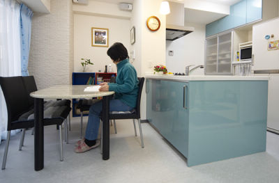 キッチンのダイニング側にA4サイズを3段入れられる収納をつくり、出し入れがラクな引き扉に。奥様がダイニングに座ったまま雑誌などを取り出せます。