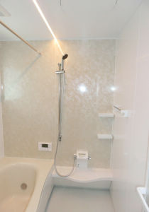 浴室はココチーノSクラス1616、有機ガラス系の浴槽を採用。汚れにくく掃除のしやすい明るい浴室になりました。LEDライトが綺麗です。