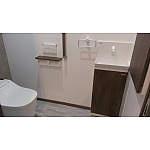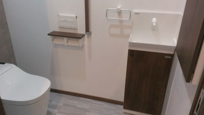 トイレはアラウーノタイプ2とアラウーノ手洗い器。断熱効果で冬も暖か。壁面に手摺りをつけ、埋め込み収納も設置しました。