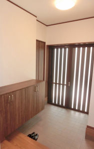 今回のリフォームでは通常の玄関収納であるコンポリアに加えて玄関クローゼットの空間を設けました。また靴を脱いで上がりやすくするために式台を新設。