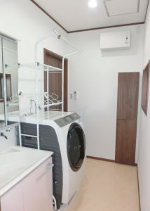 洗面化粧台は「ウツクシーズ+LED3面鏡」引き出しタイプW750を採用。側面の壁はキッチンボードで仕上げ、水はね汚れしにくくした。冬場のヒートショックを防ぐ為、洗面所暖房機を設置。壁面に埋め込み収納を設けました。
